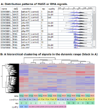 Secondly, RMA makes it difficult to separate the signal and noise range. The microarray usually has probes for all transcripts. So there must be the noise range, because not all genes are expressing in one sample, and because every measurement system has lower limit on detection. RMA hides the noise, and it also misleads the conclusion for most of analysts. You can read more about the dynamic range of microarrays.