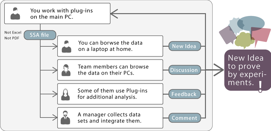 You can share data via SSA files including analysis results generated with a plug-in among free Subio Platforms on any computers of team members. We believe this is the easiest and most reasonable way to work on omics data to maximize the opportunity of discovering by team. Because nobody can extract all meanings by themselves, we think it's important to tackle the difficult task by a team. Subio Platform's plug-in system embodies a cooperative working environment.