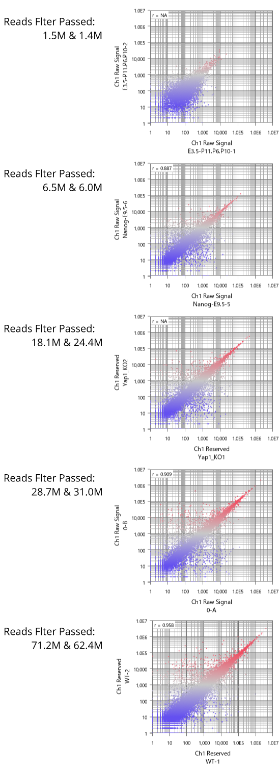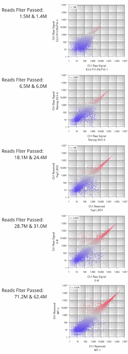 Also, if you look at many datasets, you will find that there is about a two-fold difference in the number of maximum and minimum reads in most data sets. Data analysis must be adjusted to the narrowest dynamic range by nature. So it is dangerous to rely on the theoretical maximum reads on the sequencer's catalog when estimating the required number of reads. It would be realistic to plan an experiment on the assumption that you are getting samples with a half number of the max reads.